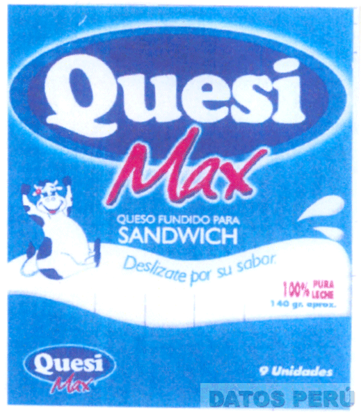 La etiqueta que contiene la denominación QUESI MAX escrita en letras características sobre una figura ovoidal, la misma que se repite en la parte inferior izquierda, en la parte central se aprecia la figura de una vaca sentada sobre una figura deslizante con gotas de leche que contiene la frase DESLIZATE POR SU SABOR escrita en letras características y leyendas alusivas al producto sin reivindicar, en los colores azul, celeste, blanco y rojo; conforme al modelo adjunto