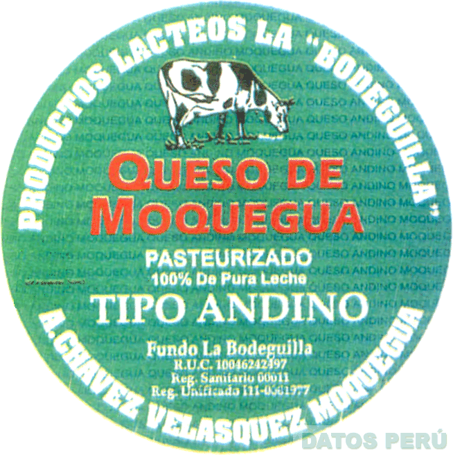 LA FIGURA CIRCULAR QUE CONTIENE LA DENOMINACION QUESO DE MOQUEGUA, SOBRE ELLA LA REPRESENTACION ESTILIZADA DE UNA VACA, EN LA PARTE SUPERIOR LA DENOMINACION PRODUCTOS LACTEOS LA BODEGUILLA ESCRITA EN LETRAS CARACTERISTICAS Y EN LA PARTE INFERIOR LA DENOMINACION A. CHAVEZ VELAZQUEZ MOQUEGUA ESCRITA EN LETRAS CARACTERISTICAS, TODO EN LOS COLORES ROJO, BLANCO, NEGRO Y VERDE; CONFORME AL MODELO ADJUNTO