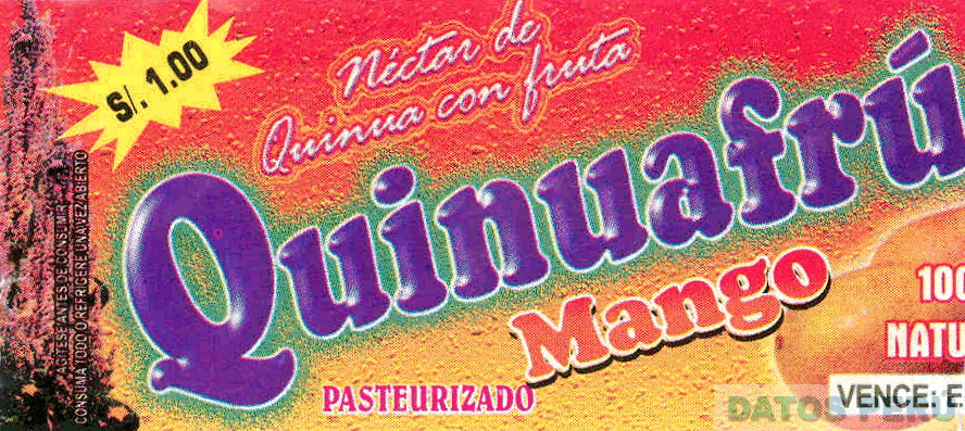 La denominación QUINUAFRÚ escrita en letras características, al lado derecho se aprecia la representación estilizada de un ramo de quinua y en la parte inferior derecha, la representación estilizada de mangos, y demás leyendas alusivas al producto, todo en colores verde, rojo, anaranjado, amarillo, blanco, negro, fucsia, morado; conforme al modelo adjunto