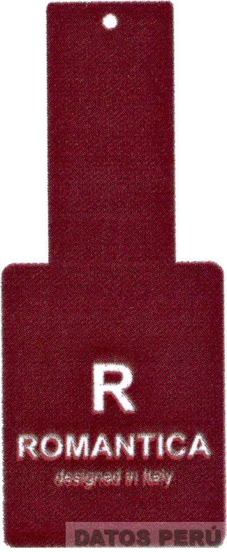 La etiqueta de forma irregular conteniendo la representación estilizada de la letra R y debajo la denominación ROMANTICA escrita en letras características, en color granate; conforme al modelo adjunto