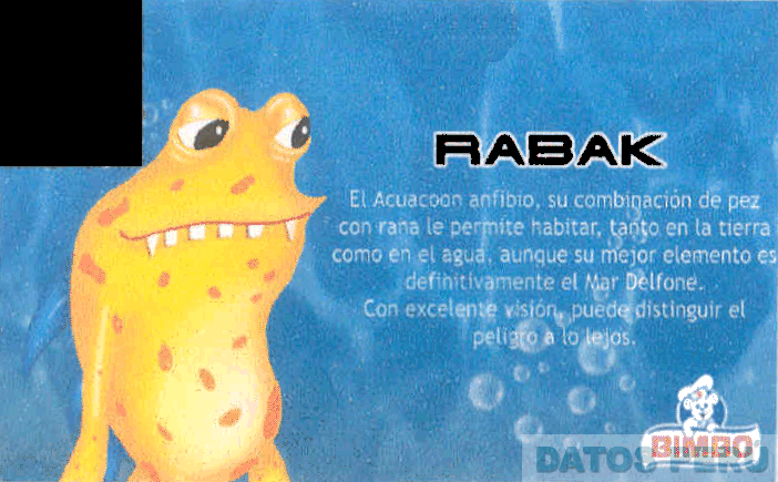 Las denominaciones RABAK y BIMBO escritas en letras características, las figuras de una rana y un oso estilizados, y demás frases sin reivindicar, en colores anaranjado, amarillo, celeste, azul, blanco, rojo y negro; conforme al modelo adjunto