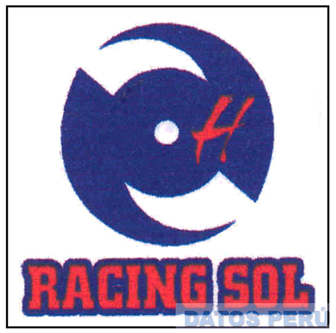 LA DENOMINACION RACING SOL ESCRITA EN LETRAS CARACTERISTICAS, EN LA PARTE SUPERIOR SE OBSERVA UNA FIGURA CIRCULAR EN CUYA PARTE CENTRAL SE APRECIA UN CIRCULO Y AL LADO DERECHO DE ESTE LA LETRA H ESTILIZADA, TODO EN LOS COLORES AZUL, ROJO Y BLANCO; CONFORME AL MODELO ADJUNTO