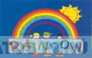 El logotipo conformado por la denominación RAINBOW dentro de una figura rectangular cuyos bordes son redondeados, sostenido por la figura estilizada de dos niñas y un niño, detrás de ellos se aprecia un arco iris y en el lado superior derecho la figura estilizada de un sol, todo en la combinación de colores rojo, anaranjado, amarillo, verde, celeste, azul y morado; conforme al modelo adjunto