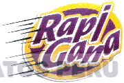 La denominación RAPI GANA escrita en letras características dispuesta en dos líneas dentro de una figura ovalada, en el borde izquierdo se aprecian líneas de diversos grosores en posición horizontal, todo en los colores morado, amarillo, anaranjado, blanco y negro; conforme al modelo adjunto