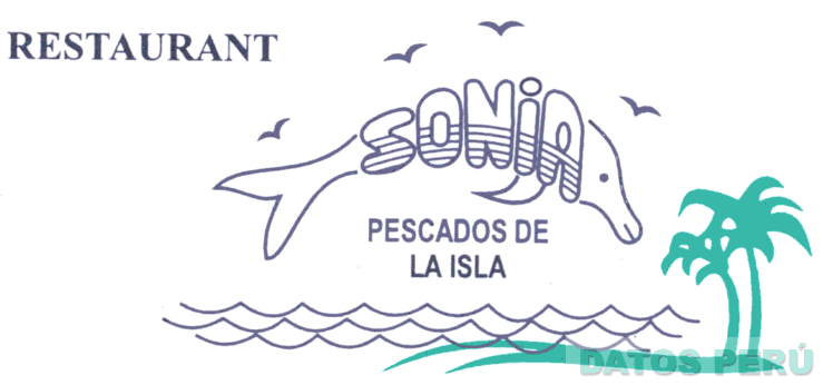 LA FIGURA DE UN DELFÍN EN EL CUAL SE APRECIA LA DENOMINACIÓN SONIA; EN LA PARTE INFERIOR EL TÉRMINO PESCADOS DE LA ISLA; EN EL EXTREMO SUPERIOR IZQUIERDO EL TÉRMINO RESTAURANT; TAMBIEN SE APRECIA LA FIGURA DE CUATRO GAVIOTAS ESTILIZADAS, OLAS MARINA Y DOS PALMERAS; EN LOS COLORES AZUL Y VERDE; CONFORME AL MODELO ADJUNTO