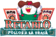 El logotipo conformado por la figura estilizada de un pollo con cresta roja y sombrero de vaquero de color marrón con overol verde de botones rojos entre puertas de un retablo en los colores anaranjado y marrón y la denominación RETABLO POLLOS A LA BRASA escrita en letras características de fondo color anaranjado con bordes verde y blanco; conforme al modelo adjunto