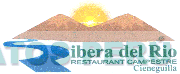 La denominación RIBERA DEL RIO escrita en letras características, RESTAURANT CAMPESTRE CIENEGUILLA escrita en letras características y la representación estilizada de un paisaje conformado por cerro, un sol y un río, todo en la combinación de los colores celeste, azul, verde, marrón y amarillo; conforme al modelo adjunto