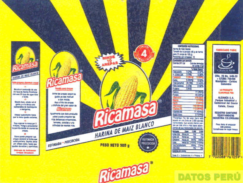 La etiqueta conteniendo la denominación RICAMASA (sin reivindicar) escrita en letras características cuatro veces, la representación de una mazorca de maíz dentro de una figura circular por triplicado, y demás leyendas alusivas al producto, todo sobre un fondo con cinco franjas verticales, en los colores verde, anaranjado, amarillo y azul; conforme al modelo adjunto