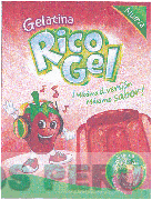 La denominación RICO GEL NUEVA GELATINA ¡MÁXIMA DIVERSIÓN MÁXIMO SABOR! SABOR A FRESA y logotipo (se reivindica colores), conforme al modelo
