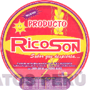 El logotipo de forma circular con triple borde que contiene en su interior la denominación RICOSON escrita en letras características y debajo la frase SABOR QUE DESPIERTA escrita en letras características, sobrepuesta a una figura irregular y de fondo la figura de una espiga de trigo, y demás frases alusivas al producto, todo en los colores rojo, amarillo, morado, blanco; conforme al modelo adjunto