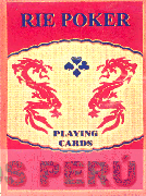El logotipo conformado por la denominación RIE POKER escrita en letras características; debajo se aprecia la representación estilizada de dos dragones; en la parte central superior la representación de un corazón, espada, trébol y diamante; en la parte central inferior las palabras PLAYING CARDS STANDARD sin reivindicar; todo dentro de una figura rectangular; en los colores amarillo, azul y anaranjado; conforme la modelo adjunto