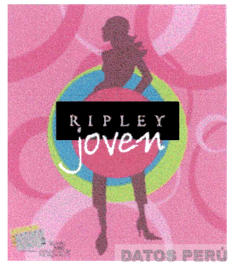 La figura estilizada de una mujer de pie en color morado sobre un fondo en diferentes tonos de color rosado y la denominación RIPLEY JOVEN escrita en letras características de colores negro y blanco, donde la palabra RIPLEY se encuentra dentro de un rectángulo de color negro sobre la figura de tres círculos en los colores verde limón, turquesa y fucsia; conforme al modelo adjunto