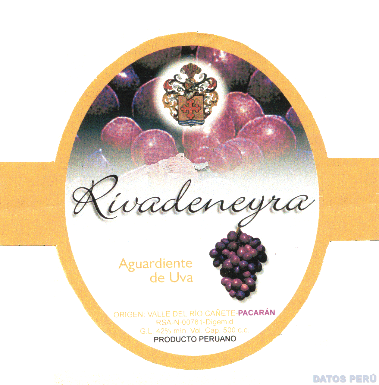 LA ETIQUETA OVALADA CONFORMADA POR LA DENOMINACION RIVADENEYRA ESCRITA EN LETRAS CARACTERISTICAS Y LAS FIGURAS CARACTERISTICAS DE UN RACIMO DE UVAS, Y UN DISEÑO CARACTERISTICO, TODO EN LOS COLORES ROJO, MARRON, MORADO, NEGRO, MELON, CONFORME AL MODELO ADJUNTO