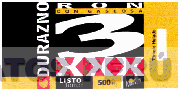 La etiqueta rectangular donde predomina el color negro y mostaza conformada en la parte superior por la palabra RON escrita en letras características en color blanco, debajo un listón color mostaza y en la parte lateral izquierda en forma vertical la palabra DURAZNO escrita en color blanco, luego en el medio el número tres escrito en forma característica ligeramente inclinado hacia la izquierda, debajo tres letras X juntas consecutivas escritas en color blanco en un listón color rojo; conforme al modelo adjunto
