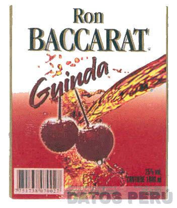 La etiqueta rectangular de color blanco y guinda con bordes dorados que contiene la denominación RON BACCARAT escrita en letras características en color negro con bordes dorados, debajo la denominación GUINDA en color guinda con bordes negros, seguida por la figura estilizada de dos guindas y la representación de un liquido en color dorado y marrón, en la parte inferior se aprecia la denominación DU DESTILERIAS UNIDAS S.A. escrita en letras características, conforme al modelo adjunto