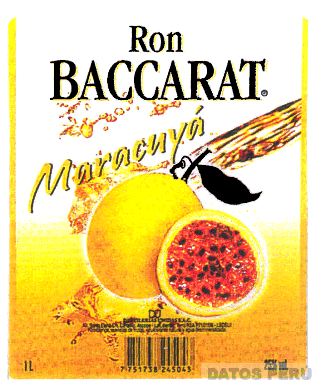 La etiqueta rectangular conteniendo la denominación RON BACCARAT MARACUYA escrita en letras características y la representación estilizada de un maracuyá y la mitad de otro, todo en los colores negro, amarillo, anaranjado y crema; conforme al modelo adjunto