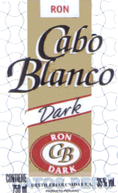 LA ETIQUETA EN COLORES BLANCO Y DORADO CONFORMADA POR LINEAS ENTRECRUZADAS DE COLOR NEGRO, EN LA PARTE SUPERIOR SE APRECIA UN RECTANGULO QUE CONTIENE LA DENOMINACION RON ESCRITA EN LETRAS CARACTERISTICAS EN COLOR ROJO, DEBAJO LA DENOMINACION CABO BLANCO ESCRITA EN LETRAS CARACTERISTICAS EN COLOR NEGRO CON BORDES BLANCOS SEGUIDA DE LA DENOMINACION DARK EN COLOR NEGRO DENTRO DE UNA FIGURA DIAGONAL CON FONDO BLANCO CON BORDES ROJOS, EN LA PARTE INFERIOR UNA FIGURA OVAL QUE CONTIENE LAS LETRAS CB EN FORMA CARACTERISTICA Y EN COLOR DORADO Y LA DENOMINACION RON DARK Y DEBAJO LA DENOMINACION DESTILERIAS UNIDAS S.A. (SIN REIVINDICAR); CONFORME AL MODELO ADJUNTO