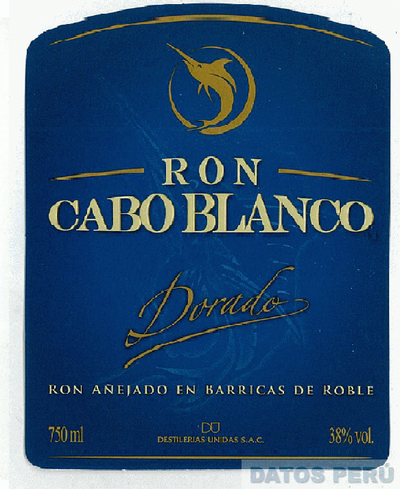 La denominación RON CABO BLANCO DORADO RON AÑEJADO EN BARRICAS DE ROBLE DU DESTILERIAS UNIDAS S.A.C. y logotipo (se reivindica colores), conforme al modelo