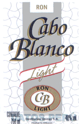 LA ETIQUETA EN COLORES BLANCO Y PLOMO CONFORMADA POR LINEAS ENTRECRUZADAS DE COLOR NEGRO, EN LA PARTE SUPERIOR SE APRECIA UN RECTANGULO QUE CONTIENE LA DENOMINACION RON ESCRITA EN LETRAS CARACTERISTICAS EN COLOR DORADO, DEBAJO LA DENOMINACION CABO BLANCO ESCRITA EN LETRAS CARACTERISTICAS EN COLOR NEGRO CON BORDES DORADOS SEGUIDA DE LA DENOMINACION LIGHT EN COLOR DORADO DENTRO DE UNA FIGURA DIAGONAL CON FONDO BLANCO Y BORDES ROJOS, EN LA PARTE INFERIOR UNA FIGURA OVAL QUE CONTIENE LAS LETRAS CB EN FORMA CARACTERISTICA Y EN COLOR DORADO Y LA DENOMINACION RON LIGHT Y DEBAJO LA DENOMINACION DESTILERIAS UNIDAS S.A. (SIN REIVINDICAR); CONFORME AL MODELO ADJUNTO