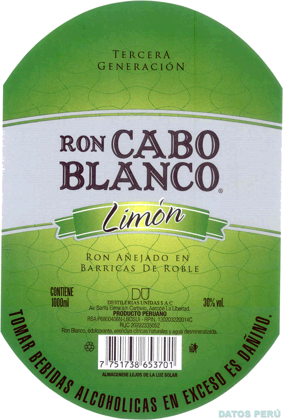 La etiqueta de fondo de color verde pantone DS 289-1C y verde claro pantone 309-1C, cuyos lados superior e inferior aparecen redondeados; en la parte superior, aparece la denominación TERCERA GENERACIÓN escrita en letras características de color negro, debajo de la cual, sobre un fondo gris pantone 877 C, aparece la denominación RON CABO BLANCO escrita en letras características de color negro y la letra R dentro de un círculo (sin reivindicar); debajo de ésta, aparece la denominación LIMÓN escrita en letras características de color negro con bordes blancos, inserta en una franja de color verde pantone DS 289-1C, verde claro pantone 309-1C y blanco, debajo de la cual aparece la denominación RON AÑEJADO EN BARRICAS DE ROBLE; más abajo, se aprecian las denominaciones DU y DESTILERIAS UNIDAS S.A.C. escritas en letras características; asimismo, se aprecian otras leyendas alusivas al producto (sin reivindicar); conforme al modelo adjunto
