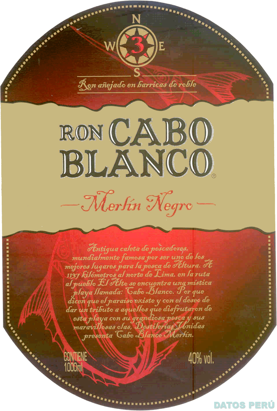La etiqueta de fondo de colores negro, marrón y rojo en distintas tonalidades, donde aparecen las figuras de dos peces espada, y cuyos lados superior e inferior aparecen redondeados; en la parte superior aparece la figura de una brújula, que en el medio contiene un número tres, en colores dorado y rojo, debajo de la cual aparece la denominación RON AÑEJADO EN BARRICAS DE ROBLE escrita en letras características de color dorado e inserta en medio de dos líneas de color dorado; en el medio del signo y sobre un fondo dorado aparece la denominación RON CABO BLANCO escrita en letras características de color negro con blanco, y la letra R dentro de un círculo (sin reivindicar); asimismo, aparece entre dos guiones, la denominación MERLÍN NEGRO escrita en letras características de color rojo; en la parte inferior se aprecia un texto escrito en letras características de color dorado; y demás leyendas alusivas al producto (sin reivindicar); conforme al modelo adjunto