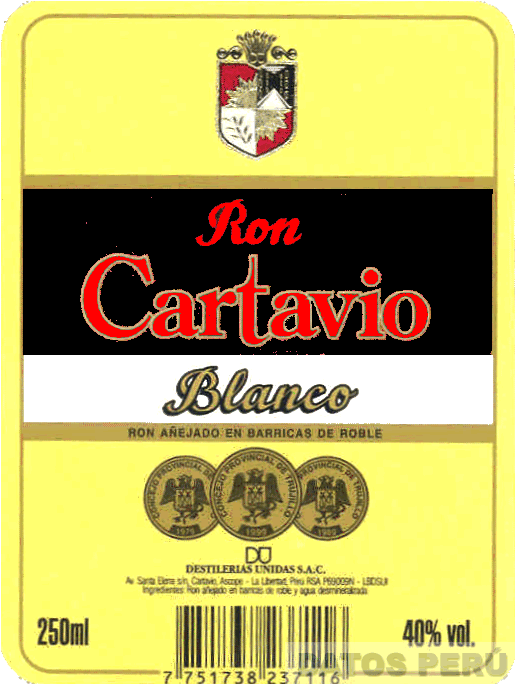 LA ETIQUETA DE COLOR AMARILLO CON BORDES DE COLOR DORADO QUE CONTIENE LA DENOMINACION RON CARTAVIO BLANCO ESCRITA EN LETRAS CARACTERISTICAS EN COLORES ROJO Y DORADO DENTRO DE UNA FIGURA RECTANGULAR DE FONDO COLOR NEGRO Y BLANCO CON BORDES DE COLOR DORADO; EN LA PARTE SUPERIOR APARECE LA FIGURA DE UN ESCUDO CON LA REPRESENTACION DE UNA CORONA, UN SOL, UNA PLANTA DE CAÑA, UN DEPOSITO DE BARRILES EN COLORES DORADO, ROJO, NEGRO Y BLANCO; EN LA PARTE INFERIOR APARECEN TRES CIRCULOS CONTENIENDO ESCUDOS EN COLORES NEGRO Y DORADO; CONFORME AL MODELO ADJUNTO