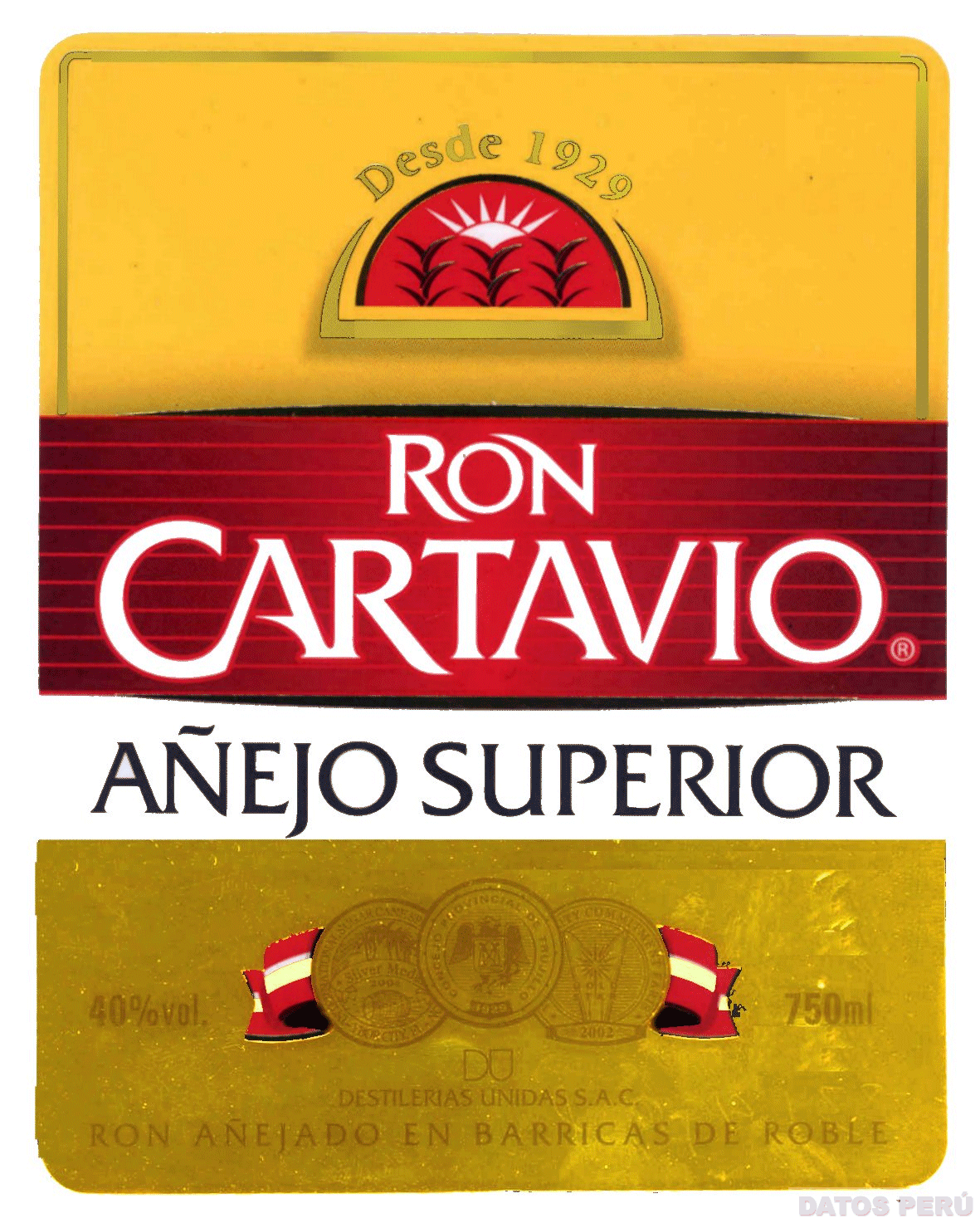 La etiqueta de bordes redondeados, en cuya parte superior, sobre un fondo de color amarillo, se aprecia la figura de una media luna de color rojo con borde negro y dorado que contiene la figura de tres plantas de caña en color negro y la figura de un sol en color blanco; en la parte superior se observa la denominación DESDE 1929 escrita en números y letras características, en la parte central aparece sobre un fondo rojo rayado la denominación RON CARTAVIO escrita en letras características de color blanco, debajo de la cual aparece sobre un fondo de color blanco la denominación AÑEJO SUPERIOR escrita en letras características de color negro; en la parte inferior, sobre un fondo de color dorado se observa la figura de tres círculos conteniendo escudos en colores negro y dorado y, a los lados aparecen dos cintas onduladas en los colores rojo y blanco; debajo de todo ello aparecen las denominaciones DESTILERIAS UNIDAS S.A.C., y debajo la denominación RON AÑEJADO EN BARRICAS DE ROBLE, ambas escritas en letras características de color negro; conforme al modelo adjunto