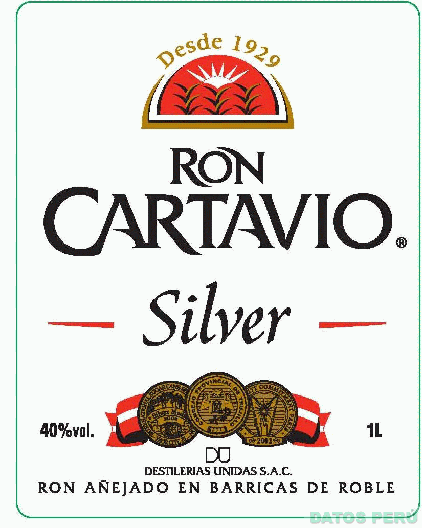 La etiqueta rectangular con esquinas redondeadas de fondo color blanco, en cuya parte superior aparece, debajo de la denominación DESDE 1929 escrita en letras características de color dorado, una figura semicircular cuyo interior es de color rojo con bordes negros y dorados, la misma que contiene la figura estilizada de tres plantas de caña en colores negro y dorado y la figura estilizada de un sol en color blanco, debajo aparece la denominación RON CARTAVIO escrita en letras características de color negro y la letra R dentro una figura circular (sin reivindicar), debajo de la cual aparece la denominación SILVER escrita en letras características de color negro en medio de dos líneas de color rojo; en la parte inferior aparecen las figuras de tres círculos conteniendo escudos en colores negro y dorado y a cuyos lados aparecen unas cintas onduladas en los colores rojo y blanco; más abajo se aprecian las denominaciones DU, DESTILERIAS UNIDAS S.A.C. y RON AÑEJADO EN BARRICAS DE ROBLE (sin reivindicar ésta última) escritas en letras características de color negro; conforme al modelo adjunto
