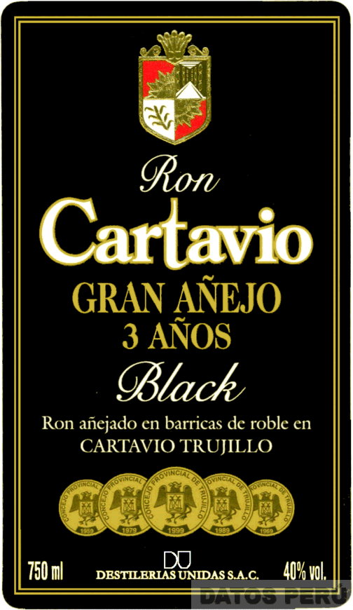 LA ETIQUETA DE COLOR NEGRO CON BORDES DE COLOR DORADO CONTENIENDO LA FIGURA DE UN ESCUDO CON LA REPRESENTACION DE UNA CORONA, UN SOL, UNA PLANTA DE CAÑA, UN DEPOSITO DE BARRILES EN COLORES DORADO, ROJO, NEGRO Y BLANCO; DEBAJO APARECE LA DENOMINACION RON CARTAVIO ESCRITA EN LETRAS CARACTERISTICAS EN LOS COLORES BLANCO, CREMA Y BORDE DORADO, SEGUIDA POR LA DENOMINACION GRAN AÑEJO 3 AÑOS ESCRITA EN LETRAS CARACTERISTICAS EN COLOR DORADO Y LA DENOMINACION BLACK EN COLOR BLANCO, EN LA PARTE INFERIOR APARECEN CINCO CIRCULOS CONTENIENDO ESCUDOS EN COLORES NEGRO Y DORADO; CONFORME AL MODELO ADJUNTO