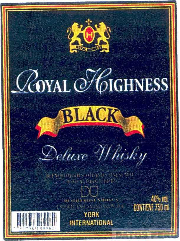 LA ETIQUETA DE COLOR NEGRO CON BORDES DE COLOR ROJO Y DORADO QUE CONTIENE EN LA PARTE SUPERIOR CENTRAL EL DISEÑO DE DOS LEONES HERÁLDICOS ALREDEDOR DE UN ESCUDO DE COLOR ROJO Y DORADO QUE CONTIENE LA LETRA H ESTILIZADA EN COLOR DORADO, DEBAJO DE LOS LEONES APARECE UNA FRANJA DE COLOR DORADO CON LA DENOMINACIÓN ROYAL HIGHNESS ESCRITA EN LETRAS CARACTERÍSTICAS EN COLOR NEGRO; EN LA PARTE CENTRAL APARECE LA DENOMINACIÓN ROYAL HIGHNESS ESCRITA EN LETRAS CARACTERÍSTICAS EN COLOR BLANCO; DEBAJO APARECE UNA FRANJA DE COLOR DORADO CON BORDES DE COLOR ROJO QUE CONTIENE LA PALABRA BLACK ESCRITA EN LETRAS CARACTERÍSTICAS EN COLOR NEGRO; DEBAJO APARECE LA FRASE DELUXE WHISKY ESCRITA EN LETRAS CARACTERÍSTICAS EN COLOR BLANCO, Y DEMÁS FRASES ALUSIVAS AL PRODUCTO; CONFORME AL MODELO ADJUNTO