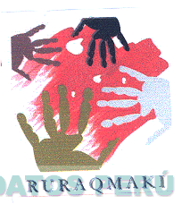 El logotipo conformado por la denominación RURAQMAKI escrita en letras características, el mismo que se encuentra subrayada, asimismo se aprecia la representación estilizada de cuatro manos acompañadas de una figura irregular, todo en la combinación de colores rojo en distintas tonalidades, gris, negro, marrón y verde; conforme al modelo adjunto