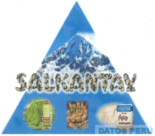 El logotipo conformado por la denominación SALKANTAY escrita a en letras características con imágenes que simulan piedras de color negro, plomo y verde; en medio de un triángulo color azul en cuya parte superior se aprecia la representación del nevado salkantay en color blanco y plomo combinados;en la parte inferior, la representación hacia la izquierda de una botella de aceite con una planta de soya, en el centro de bolsitas de fideo y hacia la derecha un paquete de harina con fondo de espigas de trigo en colores amarillo, rojo, verde, azul, blanco y amarillo dorado; conforme al modelo adjunto