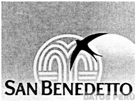 LA ETIQUETA RECTANGULAR CONTENIENDO LA DENOMINACION SAN BENEDETTO CON SU ESCRITURA CARACTERISTICA Y LA FIGURA ESTILIZADA DE UN AVE SOBREPUESTA A UNA FIGURA SEMICIRCULAR CONTENIENDO LA REPRESENTACION ESTILIZADA DE UNA FUENTE, CONFORME AL MODELO ADJUNTO