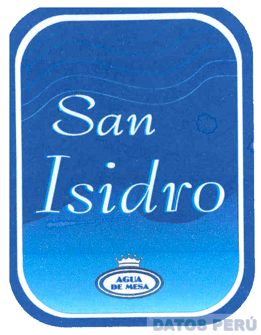 LA DENOMINACIÓN SAN ISIDRO ESCRITA EN LETRAS CARACTERÍSTICAS, EN LA PARTE SUPERIOR SE OBSERVAN CINCO LINEAS ONDULANTES, EN LA PARTE INFERIOR SE APRECIA LA REPRESENTACIÓN DE UNA CORONA SOBRE UNA FIGURA OVALADA QUE CONTIENE LA FRASE AGUA DE MESA ESCRITA EN LETRAS CARACTERISTICAS, TODO DENTRO DE UNA FIGURA RECTANGULAR CON BORDES OVALADOS, EN LOS COLORES AZUL, CELESTE Y BLANCO; CONFORME AL MODELO ADJUNTO
