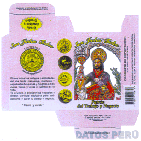 LA FIGURA DE UNA CAJA (ABIERTA) DE FONDO COLOR ROSADO CONTENIENDO EN LA PARTE FRONTAL LA DENOMINACION SAN JUDAS TADEO Y LA FIGURA DE ESTE SANTO, DEBAJO DE ESTA SE APRECIA LA DENOMINACION PATRON DEL TRABAJO Y NEGOCIO, EN LA PARTE LATERAL IZQUIERDA SE APRECIA LA FIGURA DE UNAS MONEDAS Y EN LA PARTE POSTERIOR DE LA CAJA SE APRECIA UNA FIGURA CIRCULAR CON LOS SIGNOS DEL ZODIACO, Y LA DENOMINACION SAN JUDAS TADEO, TODO EN LA COMBINACION DE COLORES MORADO, AMARILLO, VERDE, ROJO, ANARANJADO Y GRIS; CONFORME AL MODELO ADJUNTO,