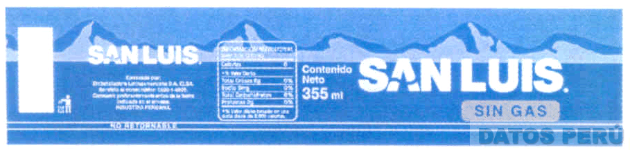 LA DENOMINACION SAN LUIS, EN LETRAS CARACTERISTICAS, DENTRO DE UNA ETIQUETA RECTANGULAR CUYO FONDO PRESENTA EL DISEÑO DE UNA CADENA MONTAÑOSA, TODO EN LOS COLORES AZUL, BLANCO, CELESTE Y GRIS; CONFORME AL FACSIMIL ADJUNTO
