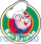 El logotipo conformado por la denominación SAN RAMON escrita en letras características, sobre la cual se aprecia una circunferencia que contiene la representación estilizada de la cara de un cerdo usando pañuelo y gorro de chef, todo ello dentro de una circunferencia de mayor tamaño y en los colores blanco, rosado, azul, rojo, amarillo, verde, celeste y negro; conforme al modelo adjunto