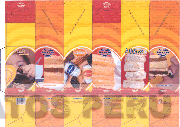 El empaque rectangular dividido en seis franjas verticales, en la parte superior de la primera y cuarta franja se aprecia una figura rectangular conteniendo la denominación PRODUCTOS SAN ROQUE escrita en letras características dentro de una figura ovalada; en la parte central de la primera franja se aprecia la denominación NATILLA SAN ROQUE escrita en letras características y debajo de ésta la figura estilizada de un recipiente conteniendo natilla, una cuchara, un mantel, parte de una tapa y parte del rostro de un niño; en la segunda franja se aprecia la denominación KING KONG SAN ROQUE escrita en letras características dentro de una figura ovalada y debajo de ésta la figura estilizada de una porción de king kong y una taza; en la tercera franja se aprecia la denominación CHOCOTEJAS SAN ROQUE CHOCOLATIER escrita en letras características dentro de una figura ovalada y debajo de ésta la representación de chocotejas, pecanas, guindones y chocolate; en la parte central de la cuarta franja se aprecia la denominación KING KONG SAN ROQUE escrita en letras características dentro de una figura ovalada, debajo de la cual se observa la representación de una porción de king kong; la quinta franja está conformada por la denominación ALFAJORES SAN ROQUE escrita en letras características sobre una figura ovalada, debajo de la cual se aprecia la representación de diversos alfajores; en la sexta franja se aprecia la denominación KING KONG SAN ROQUE escrita en letras características dentro de una figura ovalada, debajo de la cual se aprecia el perfil de una persona y una porción de king kong; todo acompañado de diversas frases y figuras alusivas al producto sobre un fondo conformado por la denominación SAN ROQUE escrita en letras características en forma repetida y en la combinación de colores azul, blanco, amarillo, crema, anaranjado, rojo, marrón en diversas tonalidades, negro, rosado, gris y celeste; conforme al modelo adjunto