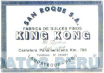 ETIQUETA RECTANGULAR CUYO FONDO LO FORMAN DOS SEMICIRCULOS SEPARADOS POR UNA FRANJA EN LA QUE APARECEN LA DENOMINACION FABRICA DE DULCES FINOS, LA DENOMINACION KING KONG, LA FRASE EL LEGITIMO DESDE 1920 Y LA DIRECCION Y TELEFONO DE LA SOLICITANTE. EN EL SEMICIRCULO SUPERIOR LLEVA LAS PALABRAS SAN ROQUE S.A. Y EN SEMICIRCULO INFERIOR LAMBAYEQUE - PERU. SOLO SE REIVINDICA LA DENOMINACION SAN ROQUE (NO SE REIVINDICAN LAS DEMAS LEYENDAS), CONFORME AL MODELO ADJUNTO,