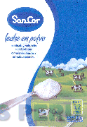 El logotipo conformado por la denominación SANCOR escrita en letras características dentro de una figura ovalada, y la representación estilizada de un paisaje rural en el que se aprecian las figuras estilizadas de cuatro vacas, una cuchara con leche en polvo, todo a su vez dentro de una etiqueta rectangular dividida por una línea curva vertical, en los colores azul en distintas tonalidades, celeste, blanco, gris, negro y verde en distintas tonalidades; conforme al modelo adjunto
