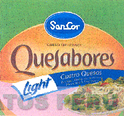 La etiqueta cuadrangular conformada por la denominación SANCOR QUESABORES LIGHT escrita en letras características, donde la denominación SANCOR se encuentra dentro de una figura ovalada encerrada a su vez en otra de mayor dimensión, la denominación QUESABORES dentro de una figura semiovalada y debajo se aprecia una figura rectangular curva conteniendo la denominación LIGHT y frases alusivas al producto; en la parte inferior se aprecia la representación de un plato de ensalada sobrepuesto a una figura semiovalada, todo en los colores anaranjado, marrón, rosado, verde, rojo, blanco y azul en distintas tonalidades; conforme al modelo adjunto
