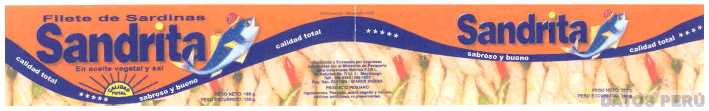 La etiqueta conformada por la denominación SANDRITA escrita en letras características y al lado derecho la representación estilizada de un pez usando un sombrero; debajo se observa una franja ondulante, la figura de un sol, cinco estrellas, la figura de trazos de sardina, y demás frases alusivas al producto, todo en los colores anaranjado, azul, morado, celeste, blanco, amarillo, rojo, beige y verde; conforme al modelo adjunto