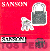 La etiqueta conformada en la parte superior por la denominación SANSON escrita en letras características y al lado derecho se aprecia la figura de un candado y un manojo de llaves; en la parte inferior se aprecia la denominación SANSON escrita en letras características al interior de una figura rectangular sombreada y al lado derecho la denominación SANSON escrita al interior de un globo terráqueo; todo en los colores rojo, negro, blanco y gris; conforme al modelo adjunto