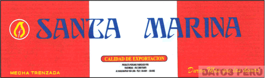 LA ETIQUETA CUYO FONDO SE ENCUENTRA DIVIDIDO VERTICALMENTE EN TRES CAMPOS EN LOS COLORES ROJO, BLANCO Y ROJO; LAS PALABRAS SANTA MARINA EN LETRAS ESTILIZADAS MAYÚSCULAS DE COLOR AZUL ESTAMPADAS SOBRE LOS TRES CUERPOS DEL FONDO; AL LADO IZQUIERDO DE COLOR ROJO, LA FIGURA DE UNA LLAMA EN BORDE DE COLOR AMARILLO DENTRO DE UN CÍRCULO DE BORDE BLANCO, EN LA PARTE CENTRAL BLANCA, DEBAJO DE SANTA MARINA UN RECUADRO RECTANGULAR ALARGADO DE ESQUINAS CIRCULARES CON BORDE COLOR NEGRO Y FONDO COLOR ROJO, EN CUYO INTERIOR SE APRECIAN LAS PALABRAS CALIDAD DE EXPORTACION ESCRITA EN LETRAS CARACTERÍSTICAS COLOR AMARILLO, MÁS ABAJO, DATOS RELATIVOS AL FABRICANTE, EN EL RECUADRO IZQUIERDO DE COLOR ROJO LAS PALABRAS MECHA TRENZADA EN LETRAS MAYÚSCULAS DE COLOR AMARILLO Y EN EL RECUADRO DERECHO DE COLOR ROJO, ABAJO, LA FRASE DURAN MAS QUE LAS DEMAS, EN LETRAS SCRIPT COLOR AMARILLO; CONFORME AL MODELO ADJUNTO