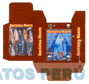 El logotipo constituido por una caja empaque conteniendo la denominación SANTÍSIMA MUERTE escrita en letras características en sus distintos lados; acompañada por las figuras estilizadas de tres cráneos y seis calaveras cubiertas con mantos; todo en los colores rojo, negro, amarillo, blanco, lila, marrón, azul, celeste y verde; conforme al modelo adjunto