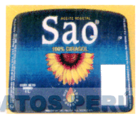 LA ETIQUETA DE COLOR AZUL EN VARIAS TONALIDADES QUE CONTIENE LA DENOMINACION SAO EN LETRAS CARACTERISTICAS DE COLOR BLANCO, DEBAJO DE ELLA UNA FLOR DE GIRASOL DE COLORES AMARILLO, ROJO Y NEGRO, DERRAMANDO UNA GOTA DE ACEITE, TODO DENTRO DE UN MARCO DE COLOR AMARILLO, CONFORME AL MODELO ADJUNTO,