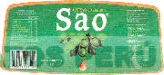 La etiqueta de forma trapezoidal con fondo verde y ribete amarillo, que contiene en la parte superior la denominación SAO escrita en letras características, en la parte central una figura representando vainas y granos de soya, y en la parte inferior una gota de aceite; todo en los colores rojo, verde, amarillo, blanco y anaranjado; conforme al modelo adjunto
