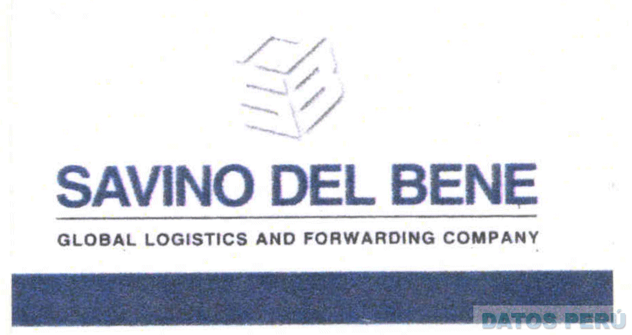 EL LOGOTIPO CONFORMADO POR LA DENOMINACION SAVINO DEL BENE Y LA FRASE GLOBAL LOGISTICS AND FORWARDING COMPANY AMBAS ESCRITAS EN LETRAS CARACTERISTICAS, Y DIVIDIDAS POR UNA LINEA HORIZONTAL; EN LA PARTE INFERIOR, UNA FRANJA RECTANGULAR OSCURA Y EN LA PARTE SUPERIOR LA FIGURA ESTILIZADA DE UN CUBO INCLINADO CON LA PROYECCION, EN CADA LADO, DE LAS LETRAS SDB ESCRITAS EN LETRAS CARACTERISTICAS; TODO EN LA COMBINACION DE COLORES AZUL, NEGRO Y BLANCO, CONFORME AL MODELO ADJUNTO