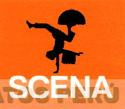 El logotipo conformado por la denominación SCENA escrita en letras características y la silueta estilizada de un malabarista apoyado sobre una mano y sosteniendo una bandeja, en los colores anaranjado, blanco y negro; conforme al modelo adjunto