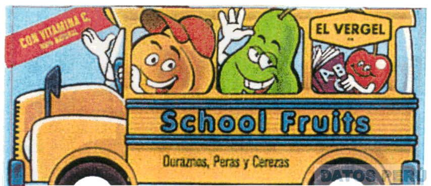 La etiqueta de forma rectangular con fondo de color celeste conformada en la parte central por un ómnibus escolar cuyos pasajeros son tres frutas animadas (durazno, de color amarillo; pera, de color verde; y cereza, de color rojo), cada una de ellas se asoma por cada una de las ventanas del ómnibus, el durazno tiene un gorro y conduce el ómnibus con la mano izquierda y con la otra saluda, la pera saluda con su mano derecha, y la cereza lee un libro de color lila en cuya carátula tiene las letras A, B y C escrita en letras características; al lado izquierdo se aprecia una franja de color rojo en forma transversal con la denominación VITAMINA C, 100% NATURAL escrita en letras características, en la parte superior de la cereza se aprecia un letrero con la denominación EL VERGEL escrita en letras características; en la parte central del ómnibus se aprecia la denominación SCHOOL FRUITS escrita en letras características azules, en medio de cuatro franjas de color azul, debajo de las dos franjas azules se encuentra la denominación DURAZNOS, PERAS Y CEREZAS escrita en letras características; conforme al modelo adjunto